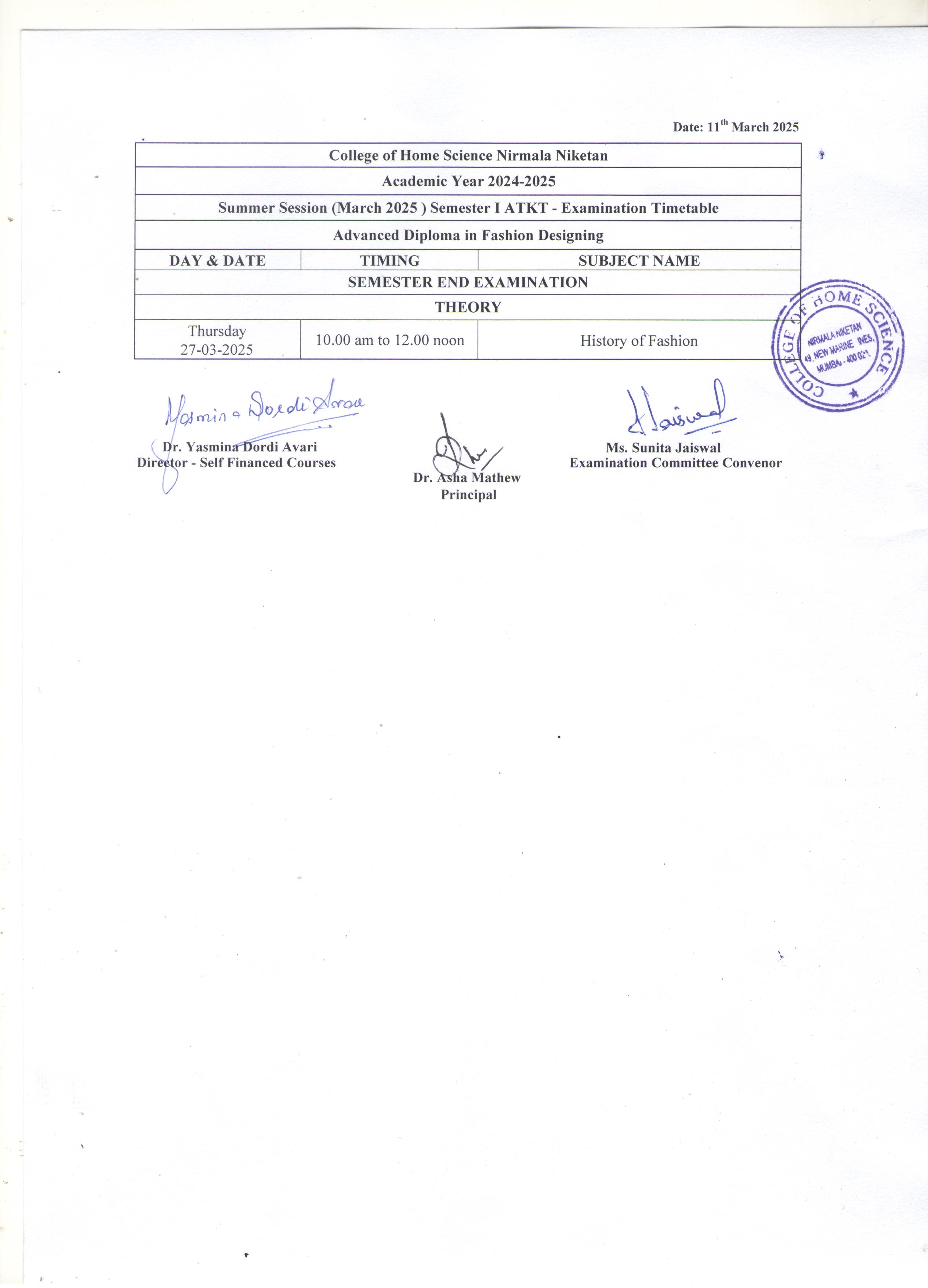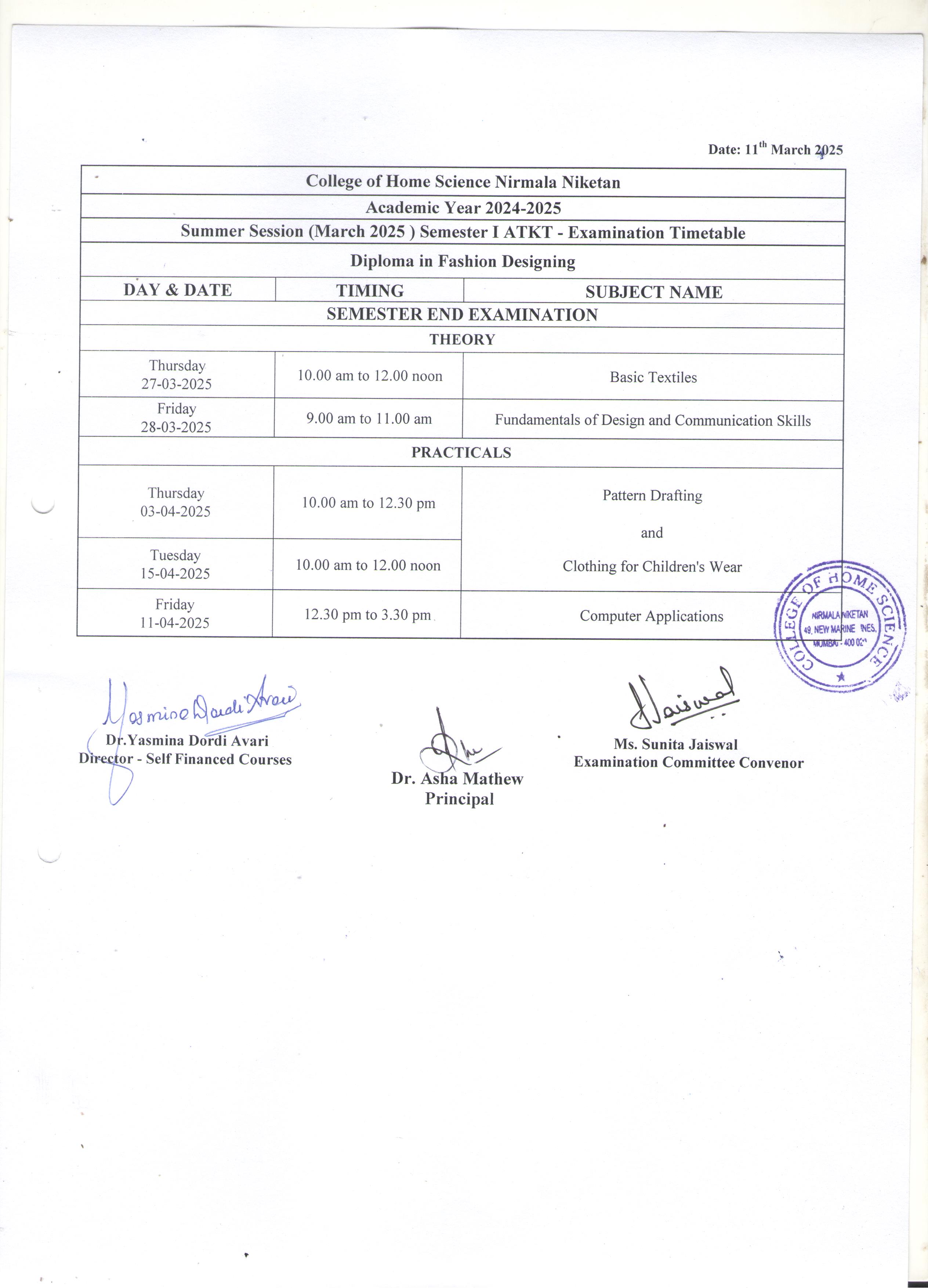 Summer Session (March 2025) Semester I ATKT Examination Timetable_Advanced Diploma in Fashion Designing by Nirmala Niketan Admin | Mar 12, 2025 | TimeTables