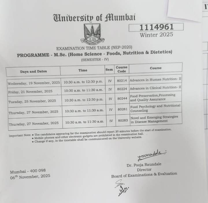 Notices 1115261 M.Sc. (Home Science – Textile & Fashion Technology (Semester I) (Winter Session 2025) Theory Examination Timetable 1114861 M.Sc. (Home Science – Human Development) (Semester I) (Winter Session 2025) Theory Examination Timetable 1115061 M.Sc. (Home Science – Sports Nutrition) (Semester I) (Winter Session 2025) Theory Examination Timetable 1113961 M.Sc. (Home Science – Food Processing & Preservation) (Semester I) (Winter Session 2025) Theory Examination Timetable 1114961 M.Sc. (Home Science – Foods, Nutrition & Dietetics) (Semester I) (Winter Session 2025) Theory Examination Timetable 1S00326 B.Sc. (Home Science) (Semester VI) (Winter Session 2025) Theory Examination Timetable SYBSc Home Science NEP 2020 Semester III Class Test Students list with Serial Numbers MSc Home Science NEP 2020 Semester I Students List with Exam Seat Nos Seating Arrangements for SYBSc Sem III CT -MSc Sem I SEE & MSc Sem III CT 1115261 M.Sc. (Home Science – Textile & Fashion Technology (Semester IV) (Winter Session 2025) Theory Examination Timetable 1114861 M.Sc. (Home Science – Human Development) (Semester IV) (Winter Session 2025) Theory Examination Timetable 1115061 M.Sc. (Home Science – Sports Nutrition) (Semester IV) (Winter Session 2025) Theory Examination Timetable 1113961 M.Sc. (Home Science – Food Processing & Preservation) (Semester IV) (Winter Session 2025) Theory Examination Timetable 1114961 M.Sc. (Home Science – Foods, Nutrition & Dietetics) (Semester IV) (Winter Session 2025) Theory Examination Timetable MSc Home Science Semester I Winter Session 2025 (NEP 2020) Practical Examination Timetable IS00326 TYBSc Semester VI Winter Session 2025 Theory Examination Timetable MSc Home Science Semester III WS2025 (NEP 2020) Theory Class Test Timetable TYBSc Home Science Semester V Winter Session 2025 Practical Examination Timetable 1S00325 B.Sc. Home Science Semester V Winter Session 2025 Theory Examination Timetable SYBSc Semester III (NEP 2020) Winter Session 2025 Theory Class Test Schedule MSc & PG Diploma Semester I Winter Session 2025 (NEP 2020) Theory Examination Timetable Seating Arrangement FYBSc Sem I NEP 2020 (25-26 Batch) Semester End Examination and MSc & PGD Sem I Class Test SYBSc Home Science Semester III & IV WS2025 Theory Examination Timetable FYBSc SEM I & Sem II (NEP 2020) Internal Class Test Timetable Winter Session 2025 ATKT Repeater Examination Notice FYBSc Home Science Semester I WS2025 NEP 2020 2025-2026 Batch Practical Examination Timetable Revised MSc Home Science Semester I WS2025 (NEP 2020) Theory Class Test Timetable Submission of Pending FYBSC (Home Science) 2024-2025 Batch- NEP 2020 Semester I SS2025 Internal Assessments FYBSc Home Science Semester II (NEP 2020) Summer Session 2025 Additional Examination notice Submission of Pending FYBSC (Home Science) 2024-2025 Batch- NEP 2020 Semester I SS2025 Internal Assessments FYBSc Semester I NEP 2020 Compensatory Class Test Notice Marksheets Distribution of TYBSc Home Sciecnce Semester V & VI Summer Session 2025 FYBSc Home Science NEP 2020 Semester I Theory Class Test Timetable AY 2025-2026 FYBSc Semester I (NEP -2020) SS2025 ATKT Examination Seating Arrangements and Examination Instructions. FYBSc SEMESTER I ATKT SS2025 (NEP 2020) Practical EXAMINATION Timetable FYBSc Home Science Semester I SS2025 (NEP 2020) Theory Examination Timetable FYBSc Home Science Semester II NEP 2020 SS2025 Additional Examination Notice Winter Session 2025 ATKT Repeater Examination forms notice for the Batches Rev-16 (Non – NEP) Syllabus FYBSc Home Science Semester II (NEP -2020) Summer Session 2025 Results Notification FYBSc Sem II – MSc Sem II & IV (NEP) SS2025 Examination Schedule NEP 2020 INSTRUCTIONS FOR EXAMINATION FYBSc Sem II MSc Sem II & Sem-IV 1115061 – MSc Home Science SN Semester IV SS2025 Theory Examination Timetable 1114961 – MSc Home Science FND Semester II SS2025 Theory Examination Timetable 1113961 – MSc Home Science FPP Semester II SS2025 Theory Examination Timetable 1115061 – MSc Home Science SN Semester II SS2025 Theory Examination Timetable 1114861 – MSc Home Science HD Semester II SS2025 Theory Examination Timetable 1115261 – MSc Home Science TFT Semester II SS2025 Theory Examination Timetable 1115261 – MSc Home Science TFT Semester IV SS2025 Theory Examination Timetable 1114861 – MSc Home Science HD Semester IV SS2025 Theory Examination Timetable 1114961 – MSc Home Science FND Semester IV SS2025 Theory Examination Timetable 1113961-MSc Home Science FPP-Semester IV SS2025 Theory Examination Timetable FYBSc Home Science Semester I (NEP 2020)- WS2024 Results Notification TYBSc Home Science Semester VI – SS2025 Results Notification 1113961 MSc Home Science FPP Sem I SS2025 Practical Examination timetable TYBSc (Home Science) Semester V SS2025 Results Notification FYBSc (HSc Rev-16)) Sem I & II and SYBSc (HSc Rev-16) Sem III & IV SS2025 Results Notification Commencement Dates of SS2025 Examinations Circular for -NEP2020 – M.Sc. Home Science -Semester-IV Commencement Dates of SS2025 Examinations Circular for -NEP2020 – M.Sc. Home Science -Semester-III Commencement Dates of SS2025 Examinations Circular for -NEP2020 – M.Sc. Home Science -Semester-I Diploma-in-Fashion-Designing-Summer-Session-June-2024-Semester-II-Examination-Timetable-ATKT Certificate-Course-in-Interior-Designing-Summer-Session-June-2024-Semester-II-Examination-Timetable-ATKT Diploma-in-Interior-Designing-Summer-Session-June-2024-Semester-II-Examination-Timetable-ATKT Diploma-in-Interior-Designing-Summer-Session-June-2024-Semester-I-Examination-Timetable-ATKT Advanced-Diploma-in-Fashion-Designing-Summer-Session-June-2024-Semester-II-Examination-Timetable-ATKT Certificate-Course-in-Graphic-Design-and-Visual-Communication-Summer-Session-June-2024-Semester-II-Examination-Timetable-ATKT Advance-Diploma-in-Interior-Designing-Summer-Session-June-2024-Semester-II-Examination-Timetable-ATKT Advanced-Diploma-in-Interior-Des